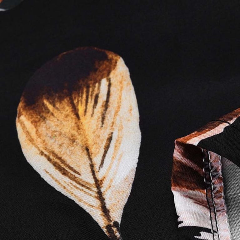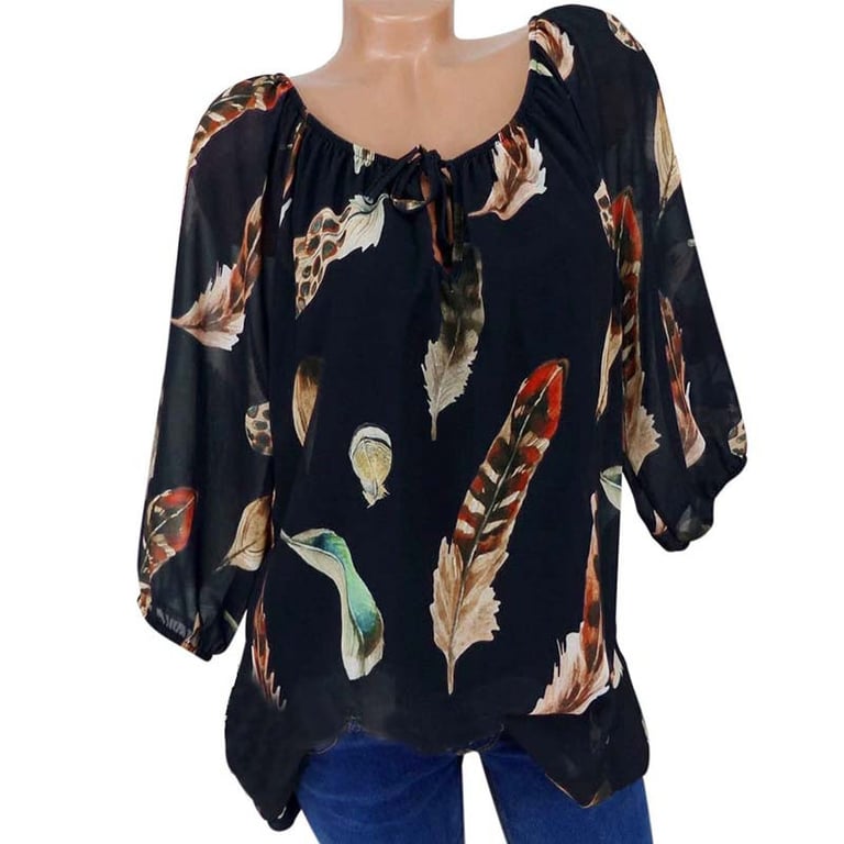 Beautiful blouse with a feather motif, pleasantly adorned with a simple ribbon and gathering. Shipping is completely free when you order!