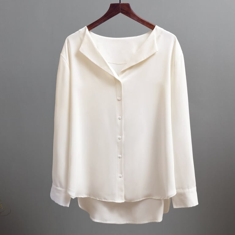 Women's elegant blouse with a V-neck and collar. Loose fit with long sleeves and button fastening. Available in several colour options.
