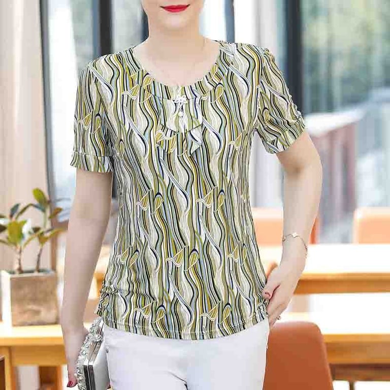 Women's blouse with short sleeves and a loose fit. The blouse features a print with a colourful pattern and a ruffled neckline. Available in multiple variants.