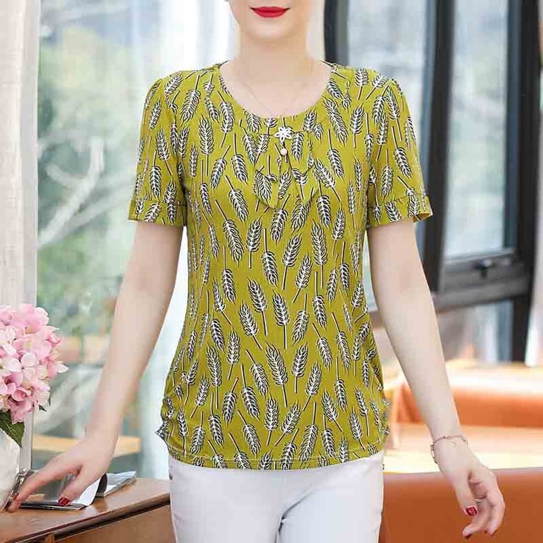 Women's blouse with short sleeves and a loose fit. The blouse features a print with a colourful pattern and a ruffled neckline. Available in multiple variants.