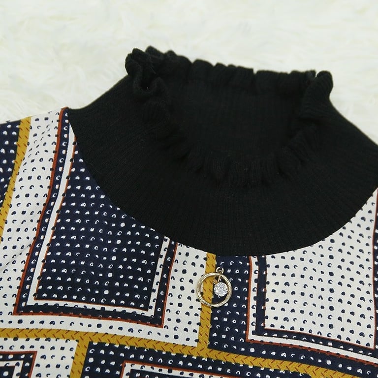 Black ruffles adorn the collar and sleeves.