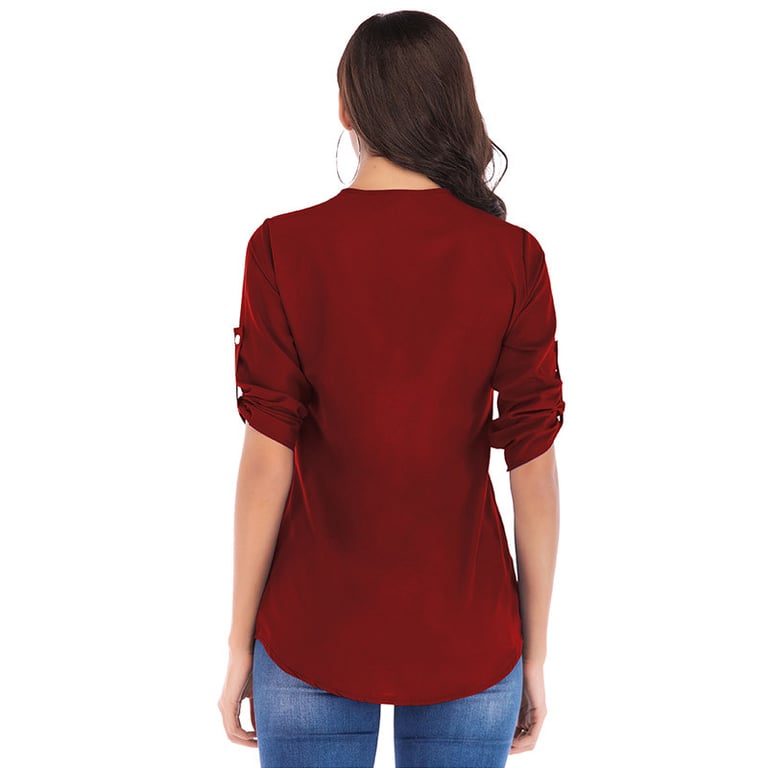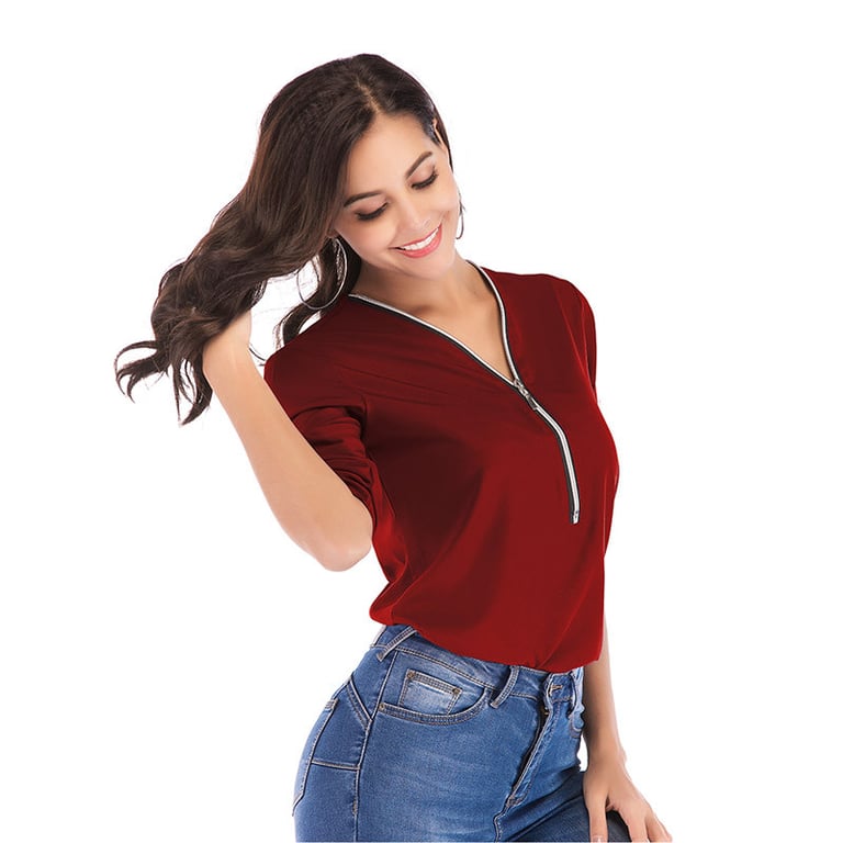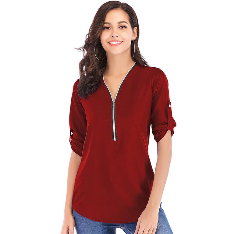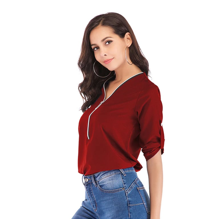 Women's long-sleeve blouse. The blouse features a V-neck with a zip fastening. Made from lightweight, breathable material. Available in several colours.