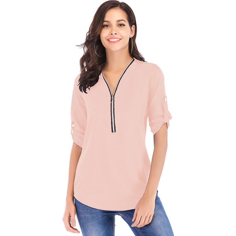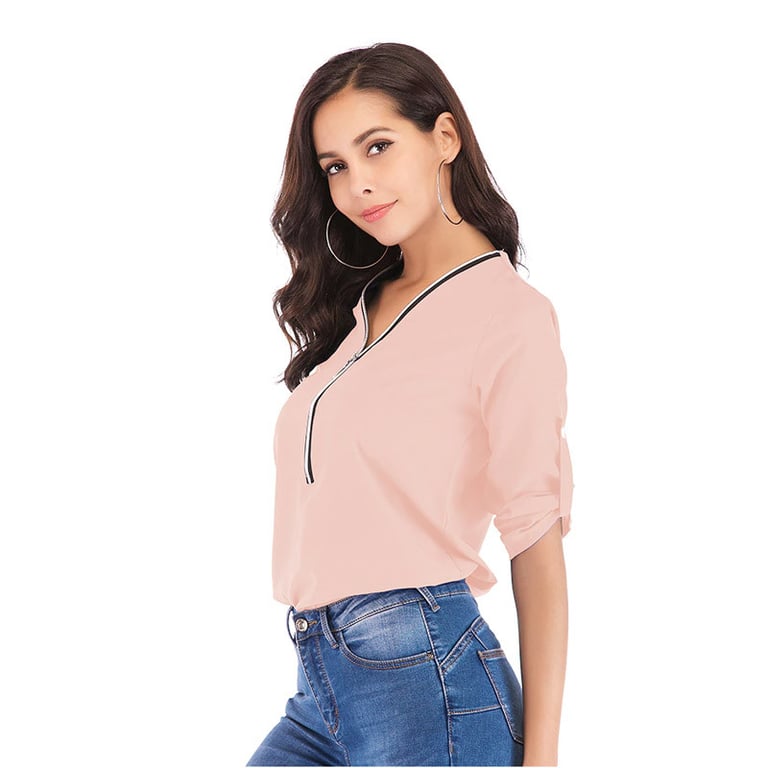 Women's long-sleeve blouse. The blouse features a V-neck with a zip fastening. Lightweight, airy material. Available in several colours.