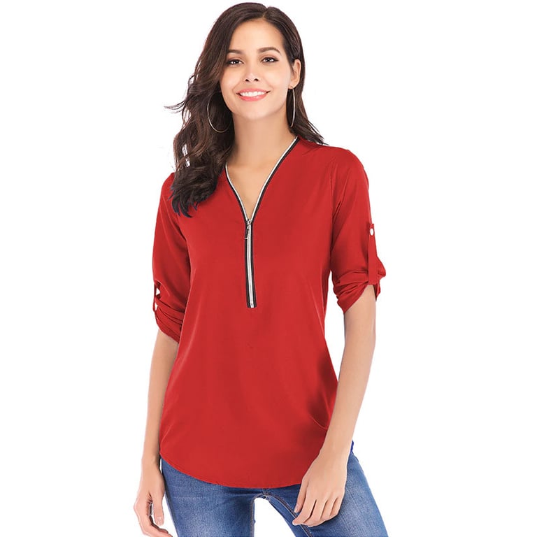 Women's long-sleeve blouse. The blouse features a V-neck with a zip fastening. Made from a lightweight, breathable material. Available in several colours.