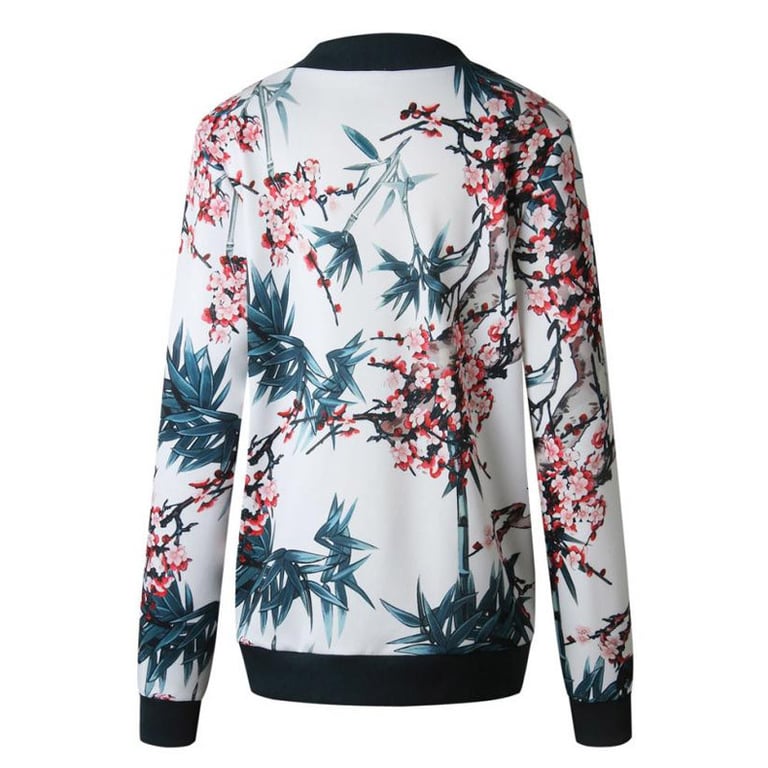 Women's lightweight bomber-style jacket. The jacket features a zip fastening and a print with a colourful floral pattern. Loose, comfortable fit. Available in several variations.