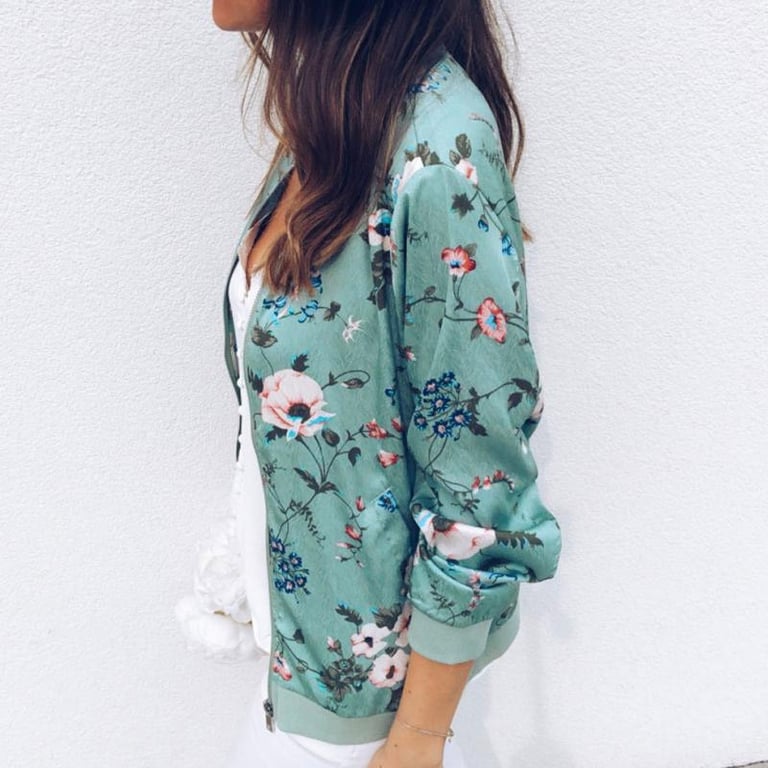 Women's lightweight bomber-style jacket. The jacket features a zip fastening and a print with a colourful floral pattern. Loose, comfortable fit. Available in several variants.