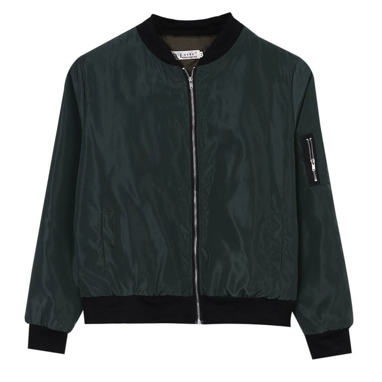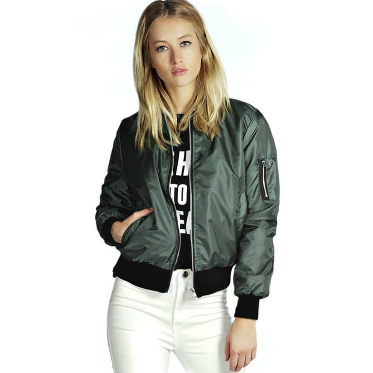 Women's modern lightweight bomber jacket. The jacket is hoodless with a low collar and a zip fastening. It features two side pockets and one zip pocket on the sleeve. Available in several colours.