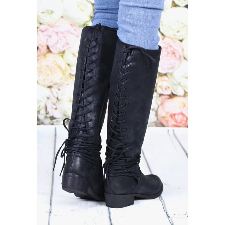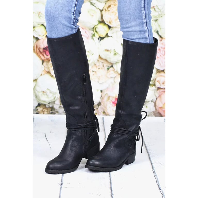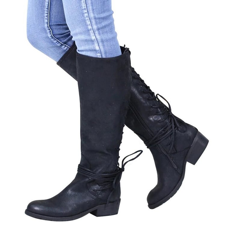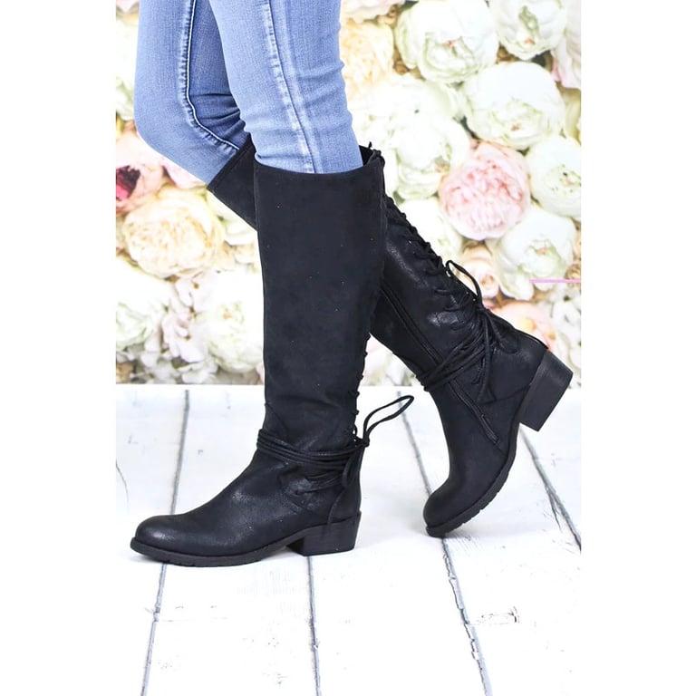 Women's high boots on a low wide heel. The boots feature a round toe, a zip fastening, and lacing at the back. Made of synthetic leather. Available in multiple variants.