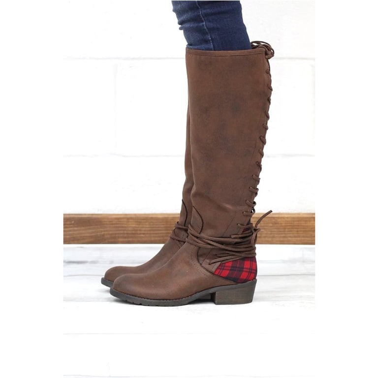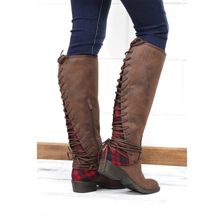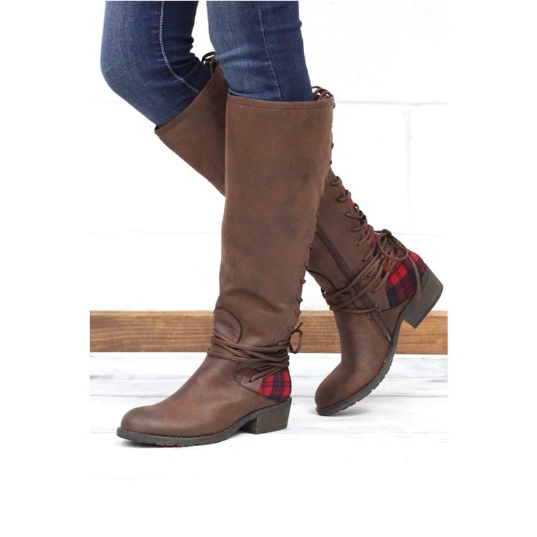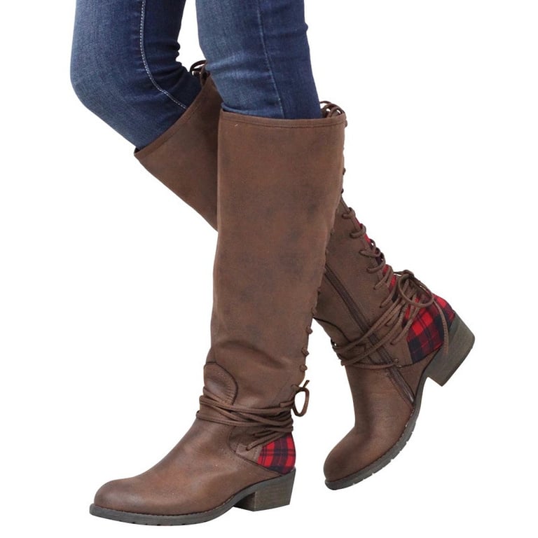 Women's high boots on a low wide heel. The boots feature a round toe, a zip fastening, and lacing at the back. Made of synthetic leather. Available in multiple variations.