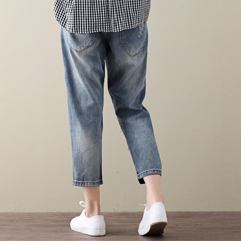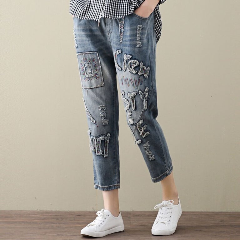 Women's boyfriend style jeans with an elasticated waistband. Wide legs. Worn look. Decorated with patches.