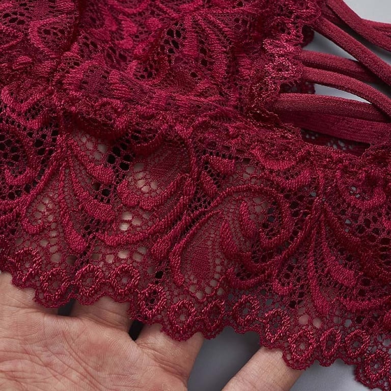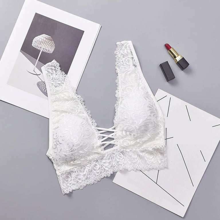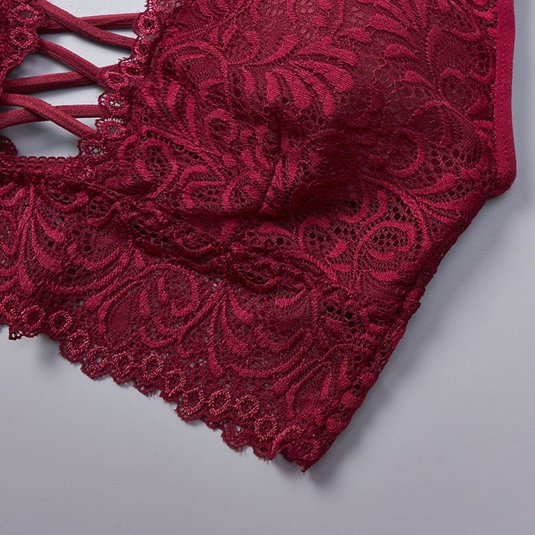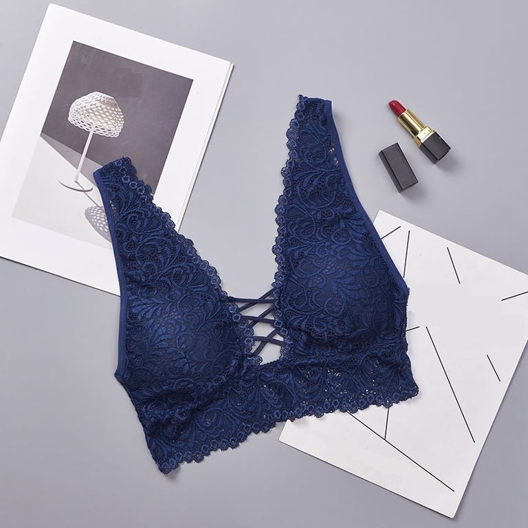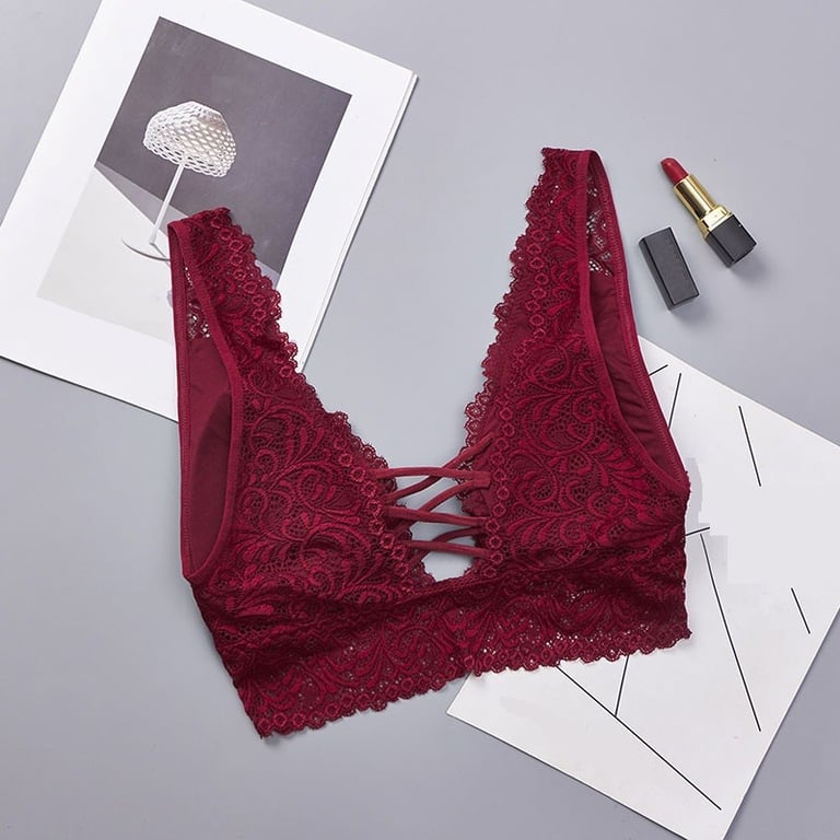 The bra features strings in the middle of the cups.