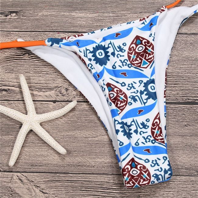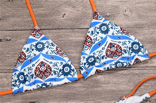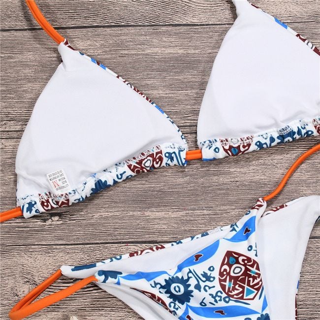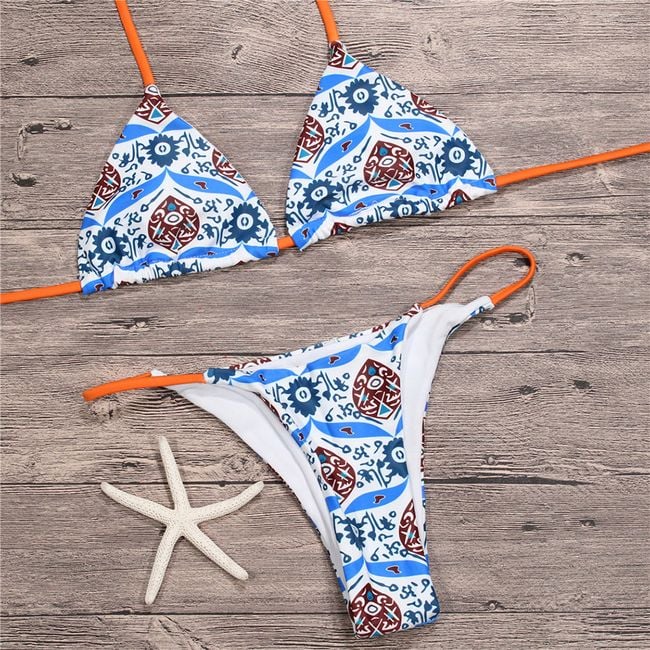 Original bikini with a tie at the back is adorned with an exotic pattern.