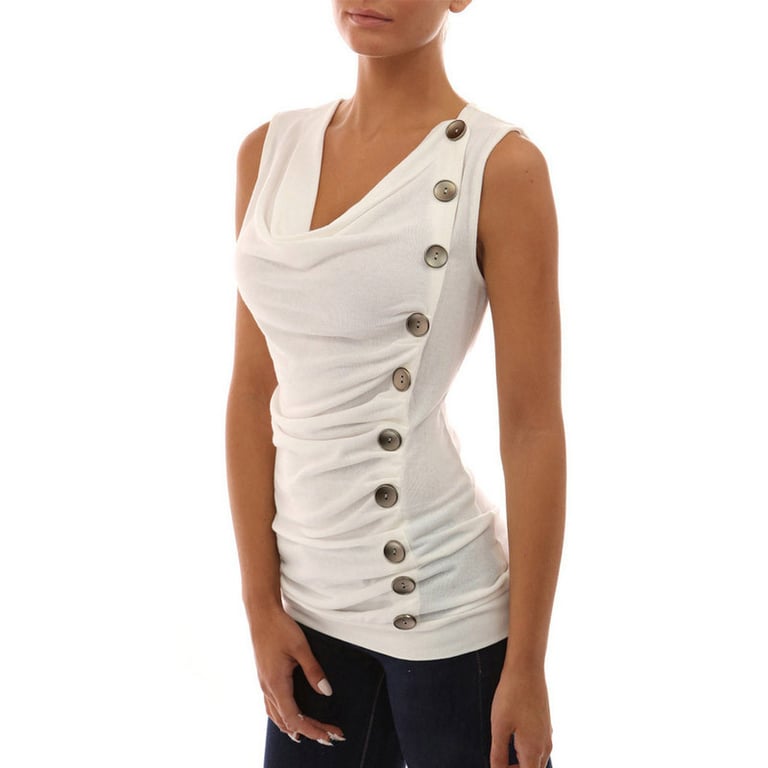 Women's sleeveless top with wide straps and a gathered neckline. Fitted cut with decorative large buttons on the side. Available in multiple colour options.