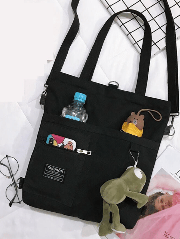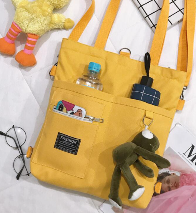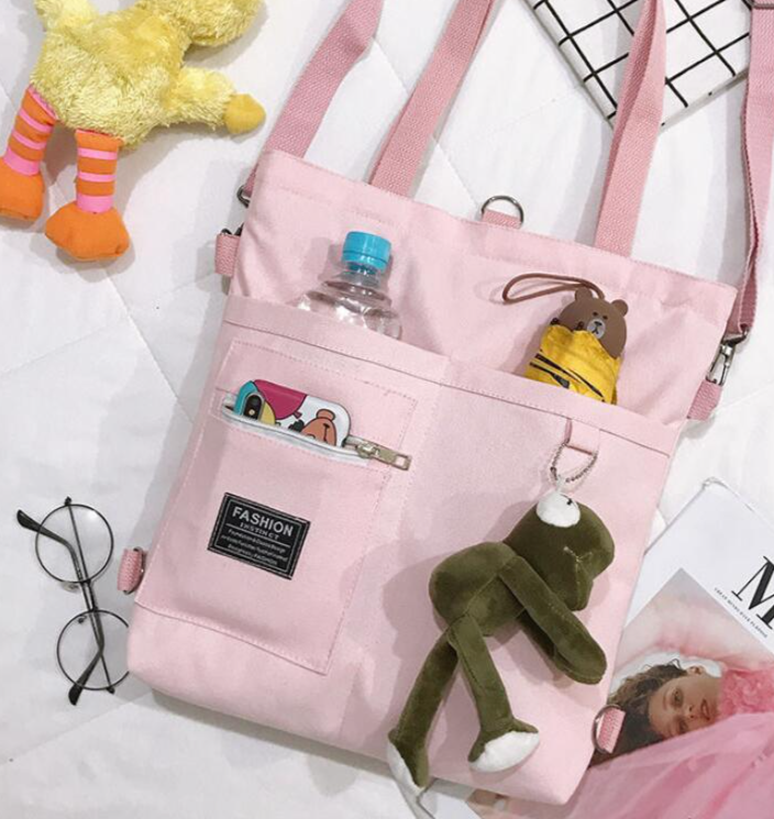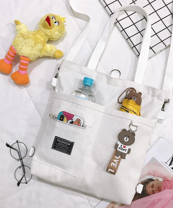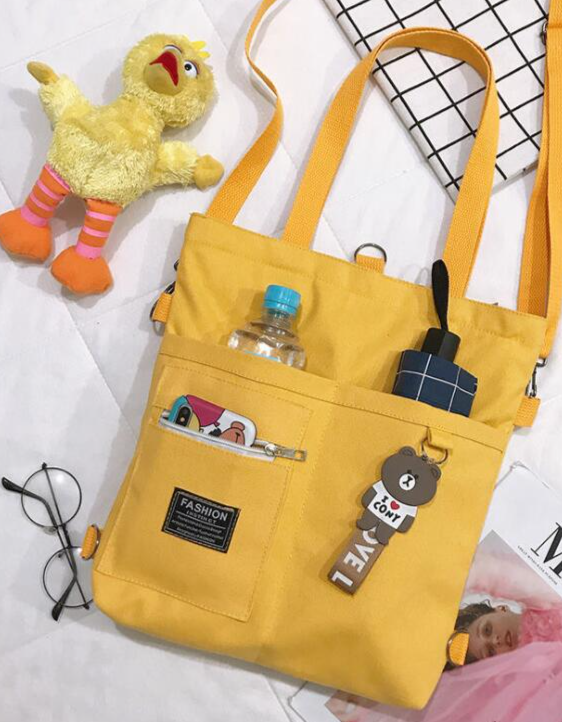 A casual, practical handbag for carrying by hand or on the back with a cute keychain.