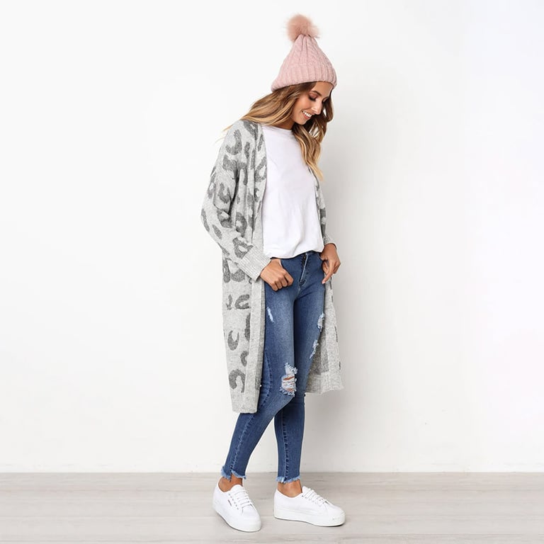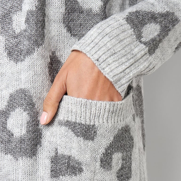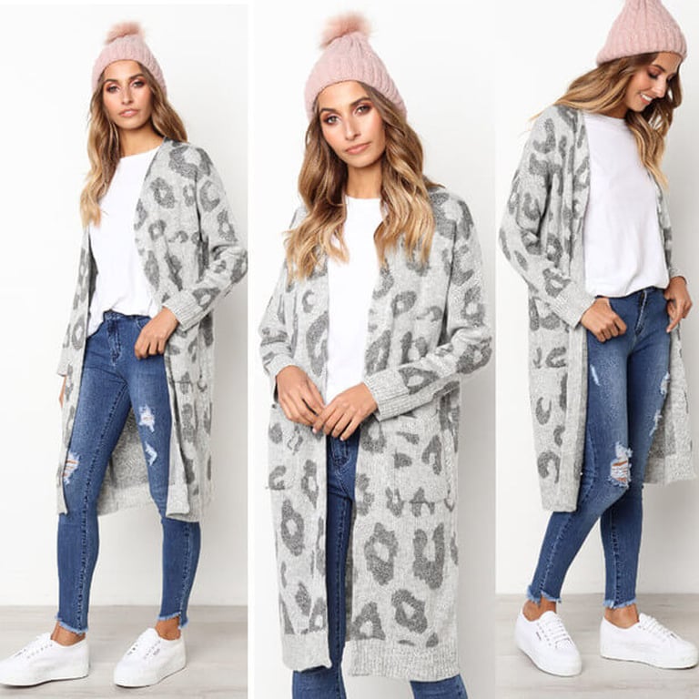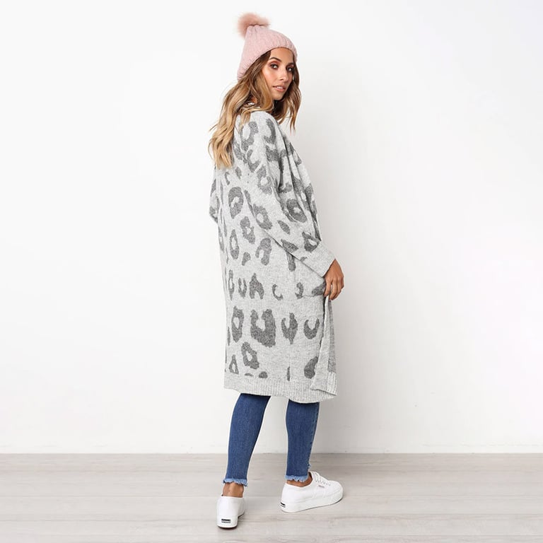 Women's long cardigan without fastening. The cardigan has a loose fit with wide sleeves, two side pockets, and an animal print. Available in several colour options.