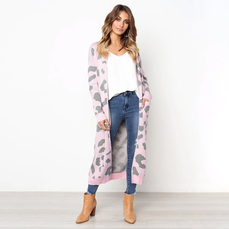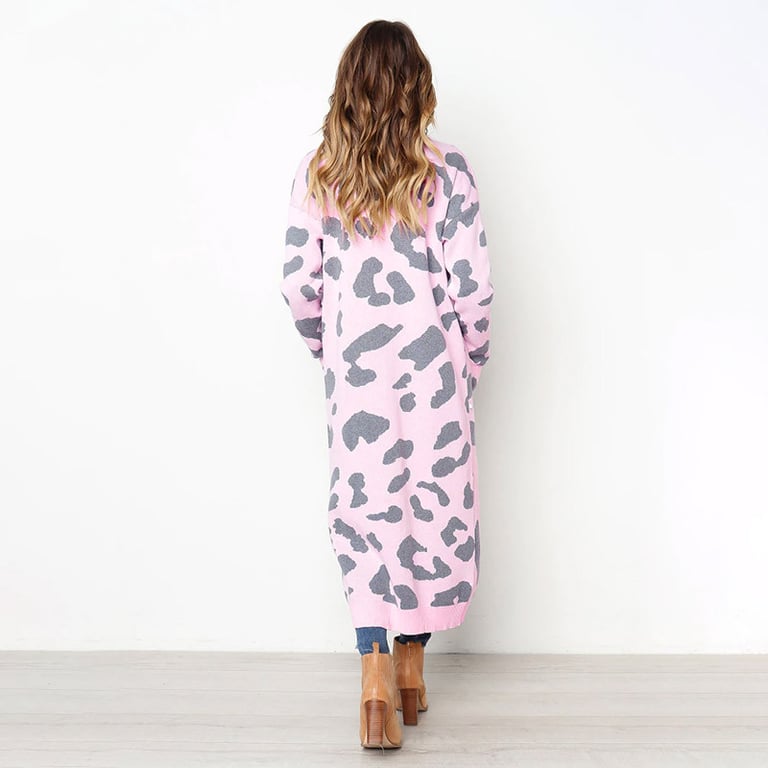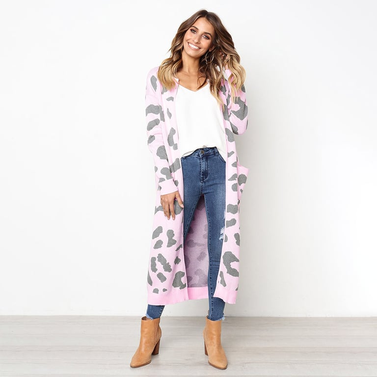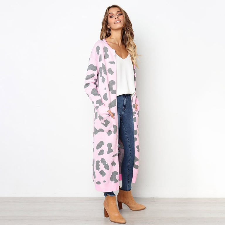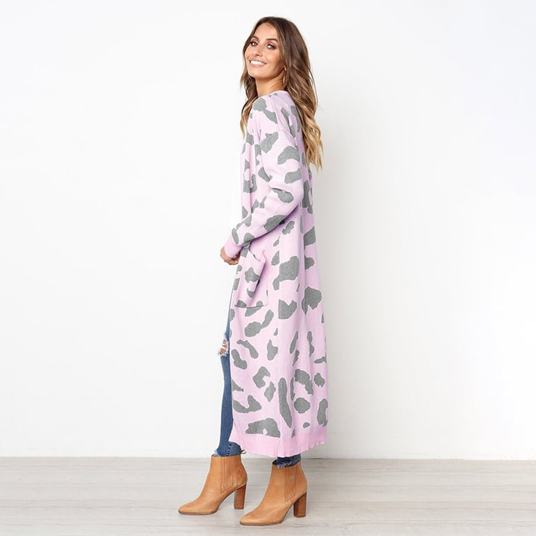 Women's long cardigan without fastening. The cardigan has a loose fit with wide sleeves, two side pockets, and an animal print. Available in several colour options.