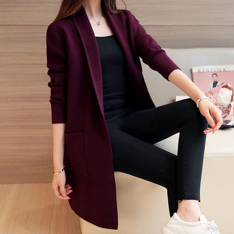 Women's knitted cardigan with long sleeves and side pockets. Loose, longer fit without fastening. Available in multiple colour options. One size fits all.