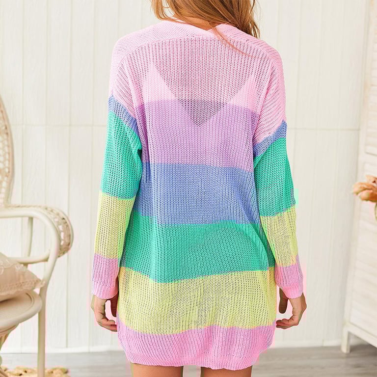 Women's cardigan without fastening. Loose long fit with long sleeves. Side pockets. Colourful rainbow pattern. Available in multiple variants.