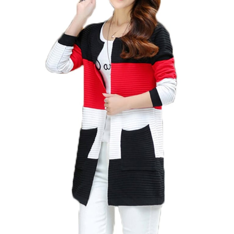 Women's cardigan with a round neckline and long sleeves. Loose, longer fit. No fastening. Side pockets. Available in multiple colour options.