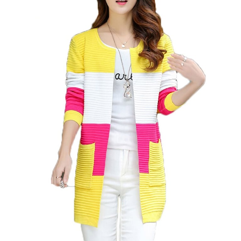 Women's cardigan with a round neckline and long sleeves. Loose, longer fit. No fastening. Side pockets. Available in multiple colour options.