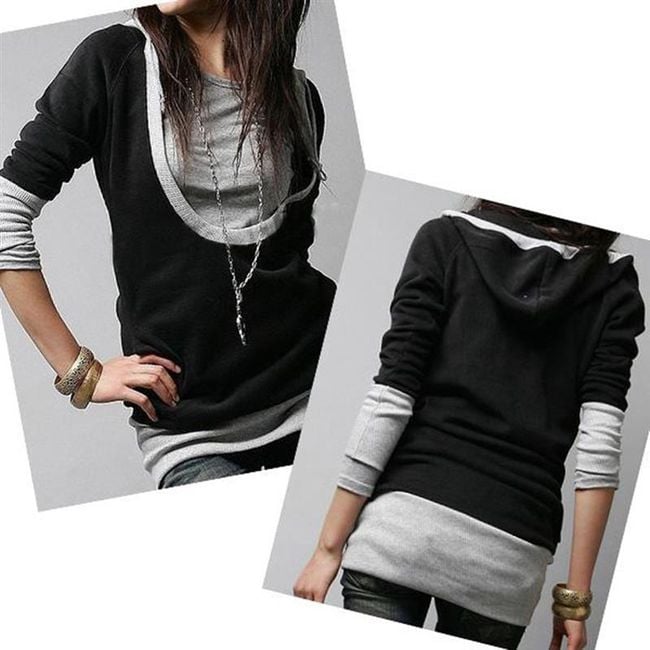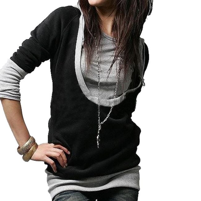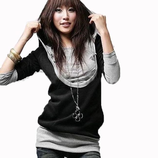Stylish hoodie with a longer sleeve features an originally cut and covered neckline.