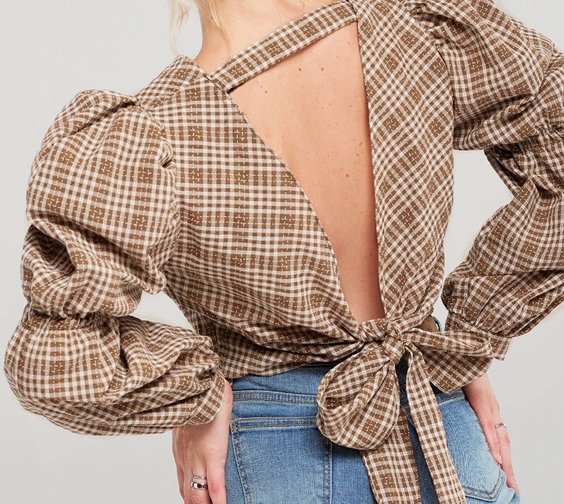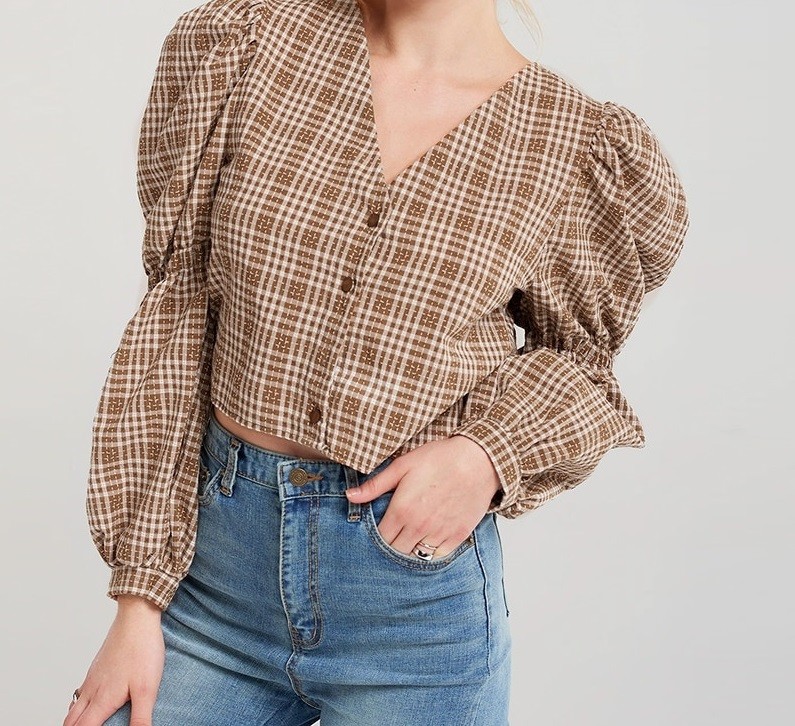 The centre part of the blouse is adorned with brown buttons.