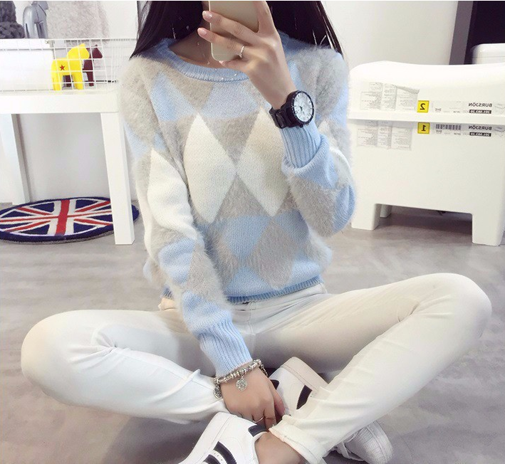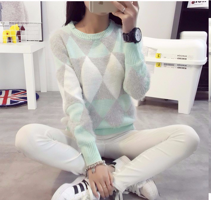 Soft colours, checked pattern. Ideal for the spring season. It has a round neckline and long sleeves.