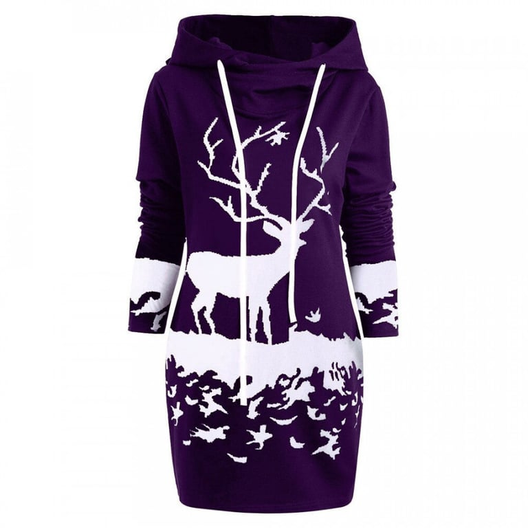 Women's hoodie dress with a hood and collar. The dress has a short fitted cut. Printed with a Christmas motif. Available in multiple colour options.