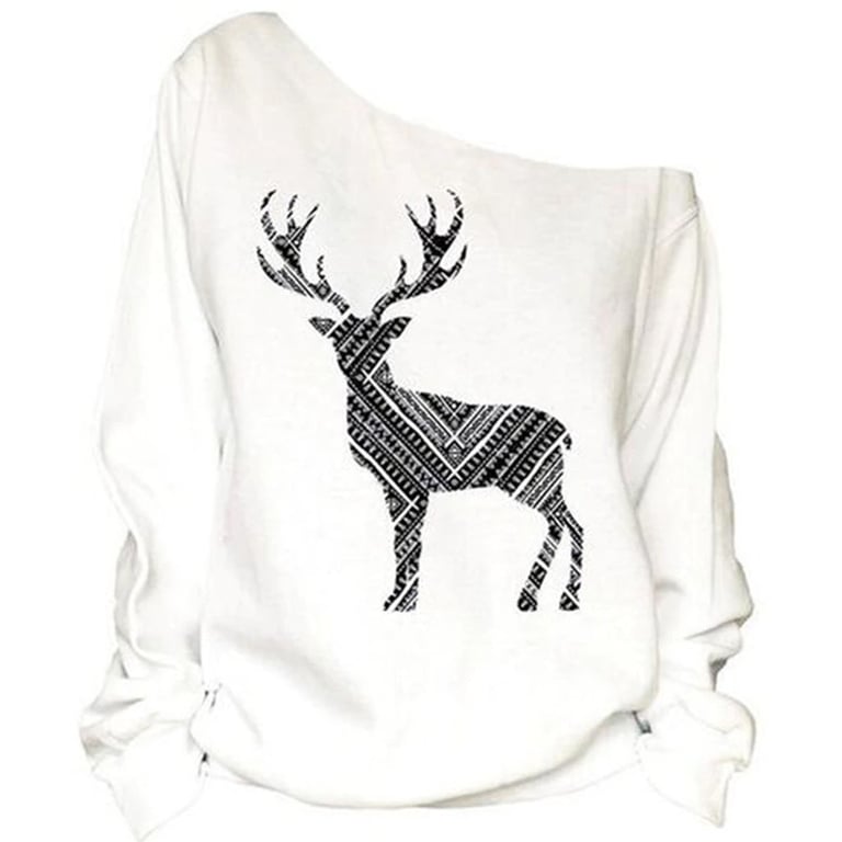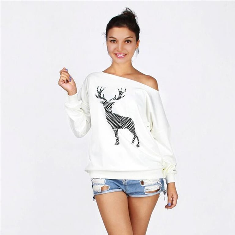 Get a stylish hoodie with a deer motif for your Christmas party. Tease the men with a bare shoulder and stay chic all evening.