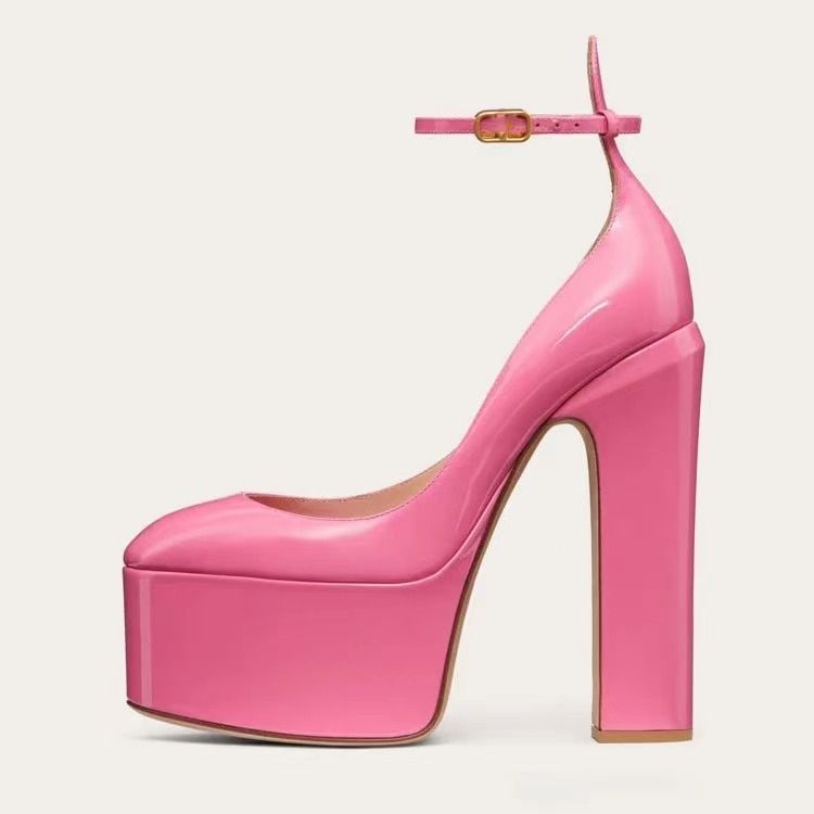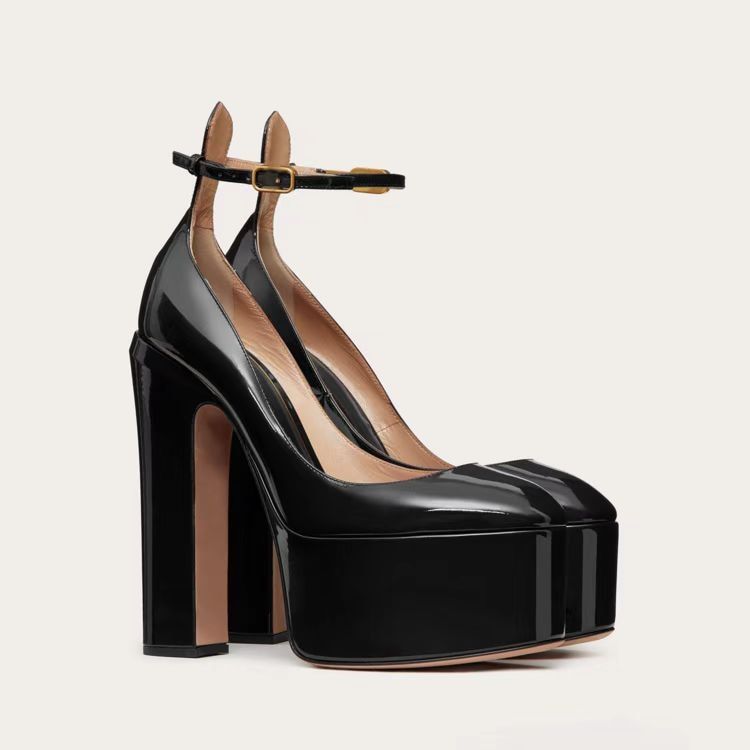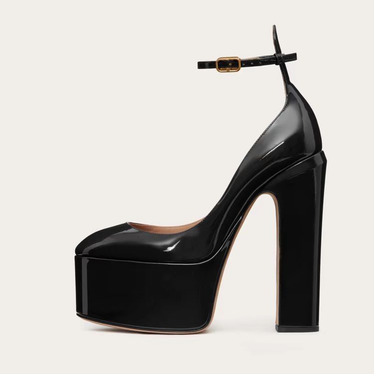 Women's glossy court shoes on a large platform with heels.
