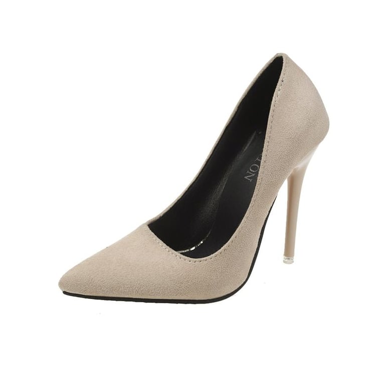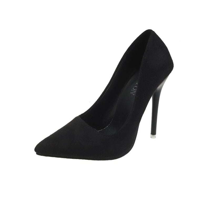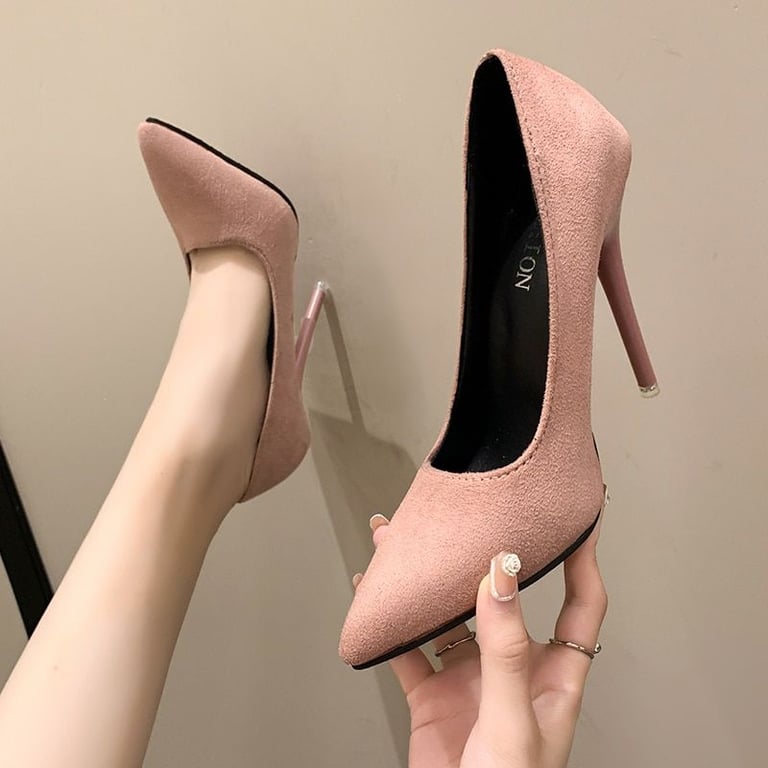 Women's pointed suede court shoes with stiletto heels.