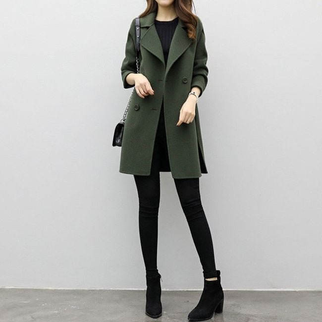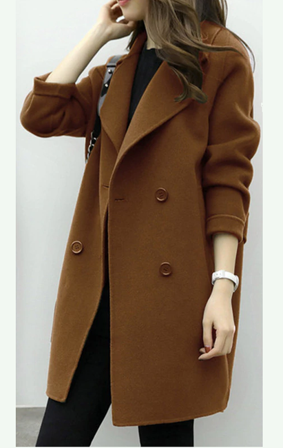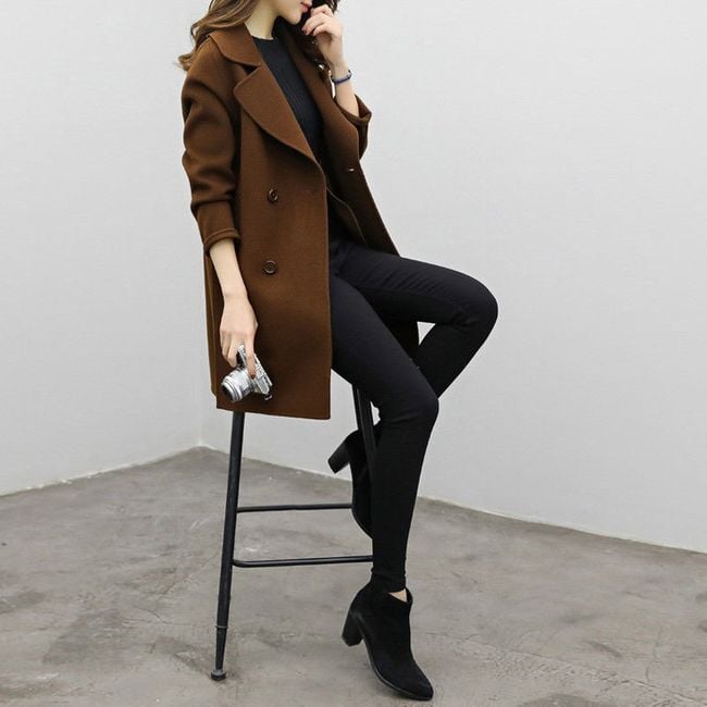 The coat has a loose fit, is adorned with striking buttons, and pairs wonderfully with fitted trousers or jeans, especially in dreary weather.