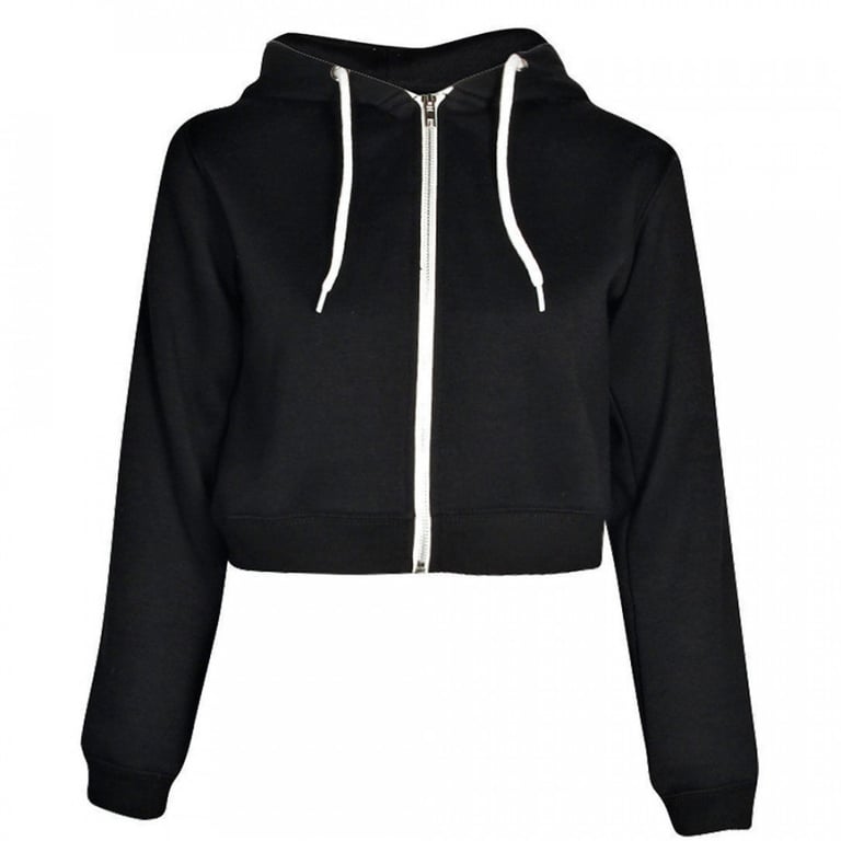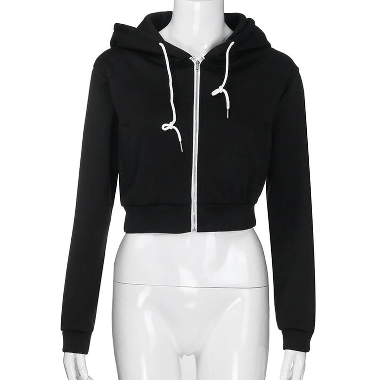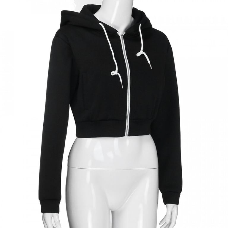 Women's cropped sweatshirt with long sleeves and a hood. Zip fastening. Available in two colour variants.