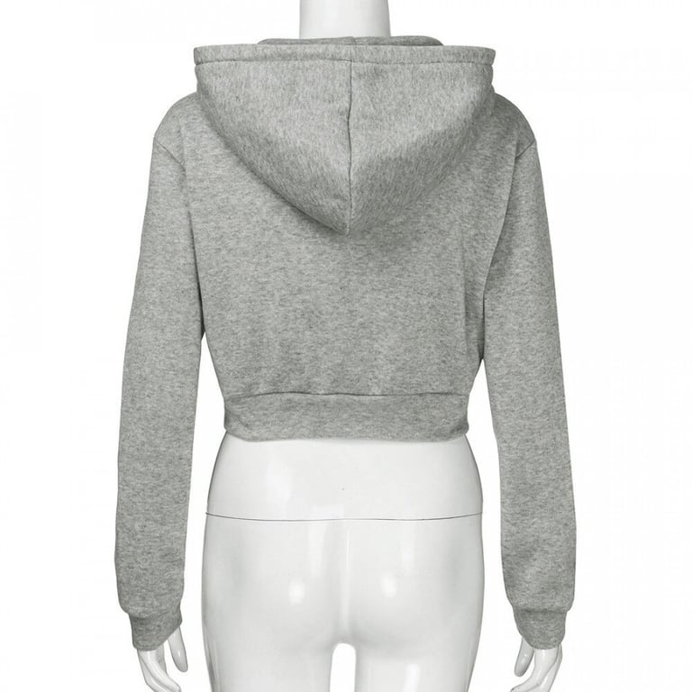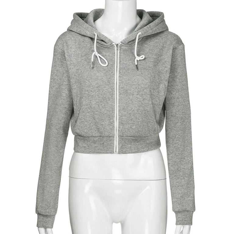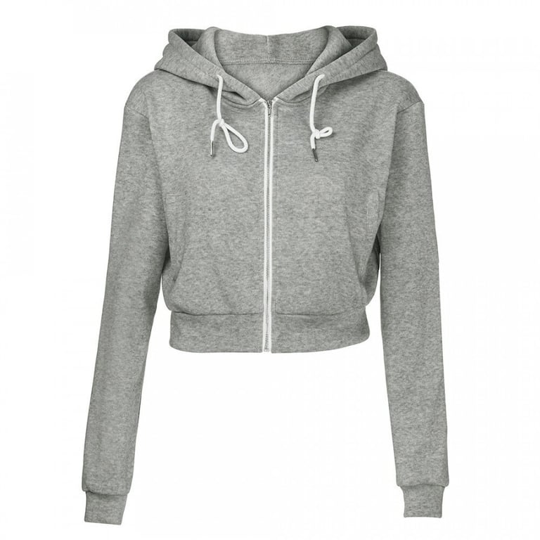 Women's cropped sweatshirt with long sleeves and a hood. Zip fastening. Available in two colour options.