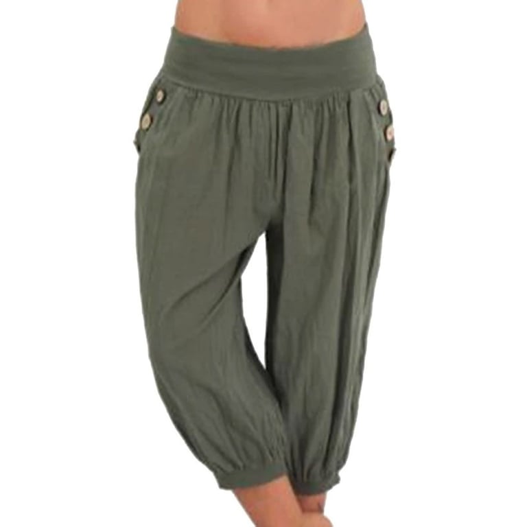 Women's cropped harem trousers with an elasticated waistband. Loose fit with a low rise and side pockets. Available in multiple colour options.
