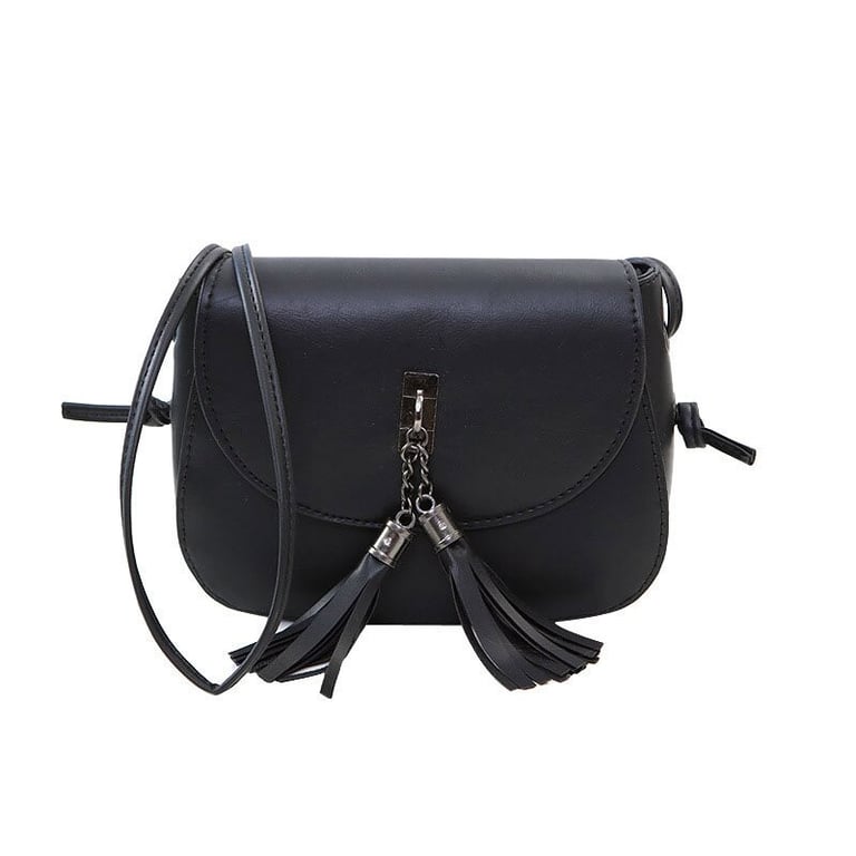 Women's faux leather handbag with fringe decoration. Long adjustable shoulder strap. Available in multiple colour options.