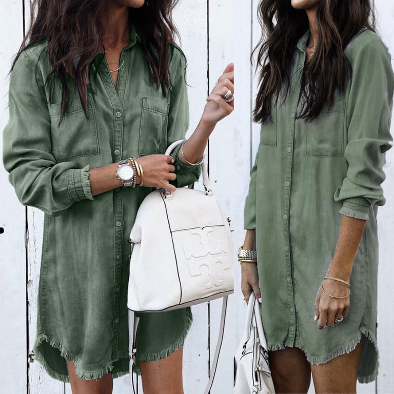 Women's short denim dress with long sleeves. The dress features a collar neckline and button fastening. Two chest pockets and decorative tearing. Available in multiple colour options.