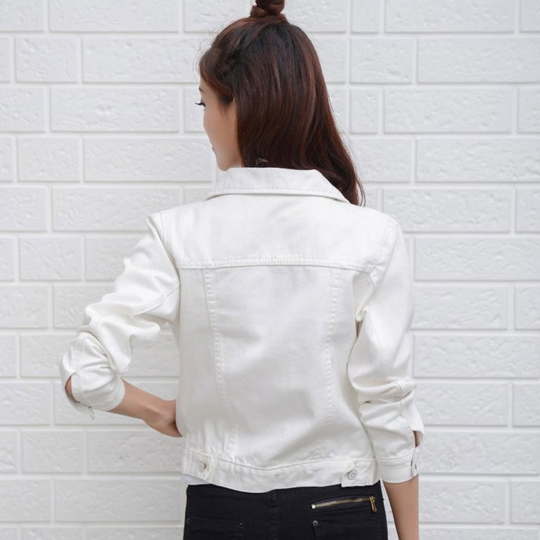 Women's denim jacket with a collar and button fastening. Chest pockets. Long sleeves. Available in multiple colour options.