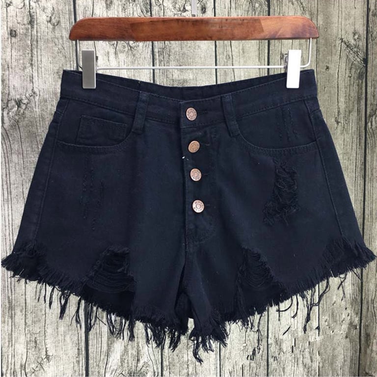 Women's high-waisted denim shorts with button fastening. Decorative distressing on the legs. Available in multiple colour options.