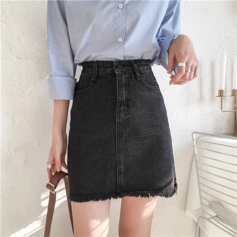 Women's high-waisted denim skirt. A-line cut with fraying. Side pockets. Available in two colour options.