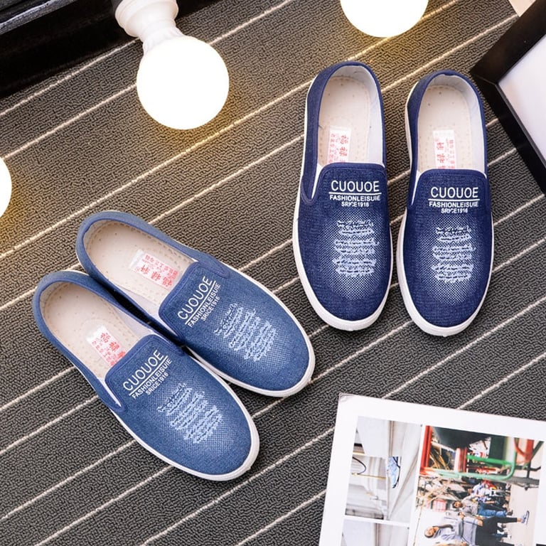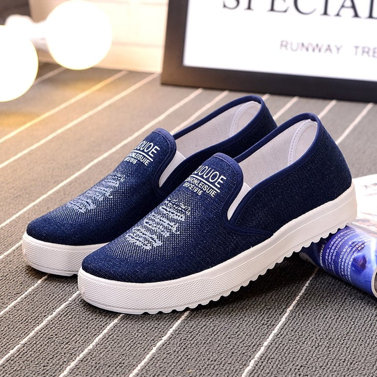 Women's slip-on shoes. Denim look printed with white lettering. Flat rubber sole. Available in two variants.