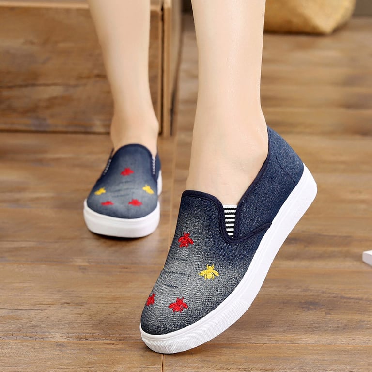 Women's denim slip-on trainers. Easy to wear with a flat rubber sole. Round toe with a colourful print. Available in two variants.