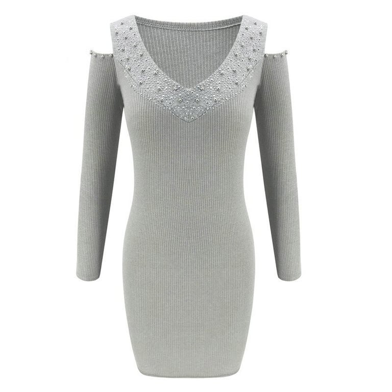 Women's ribbed dress with long sleeves. The dress has a fitted cut. Round neckline with embellishments featuring rhinestones. Available in multiple colour options.