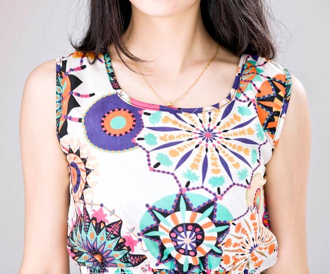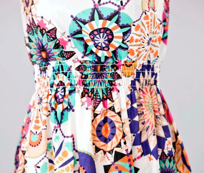 The sleeveless mini dress features an elastic waistband that adapts beautifully to your figure.