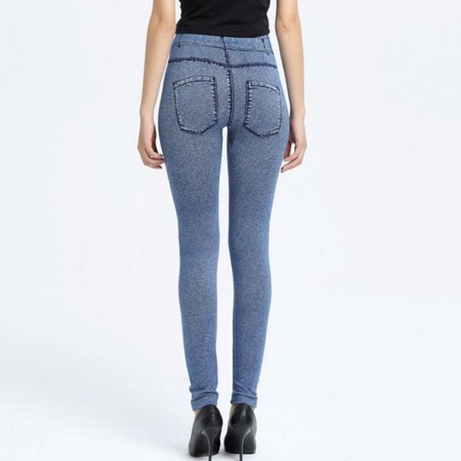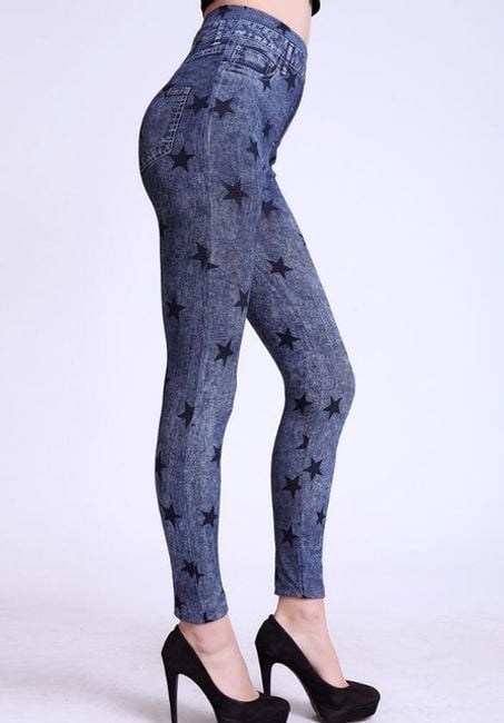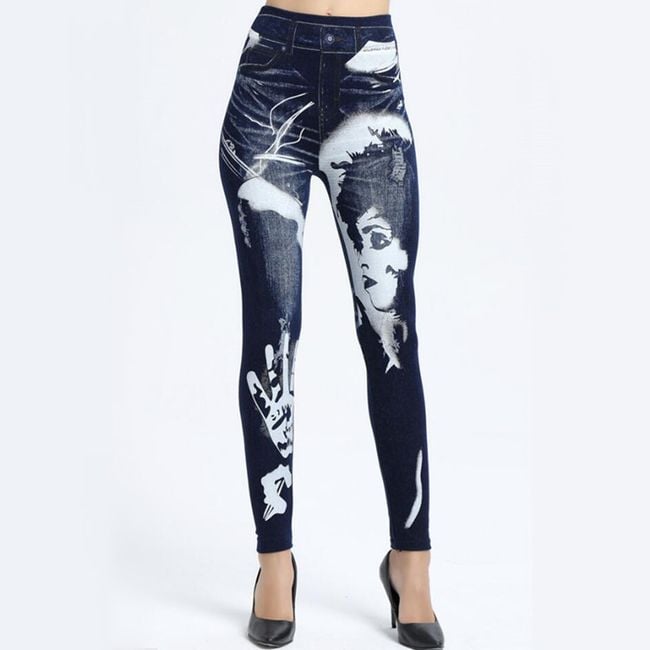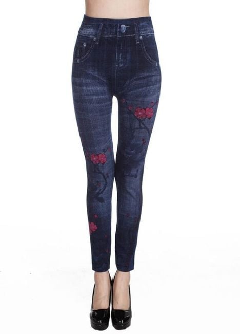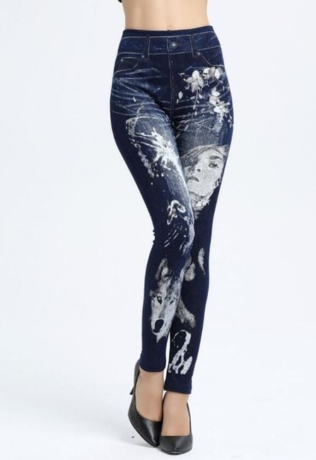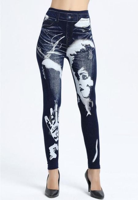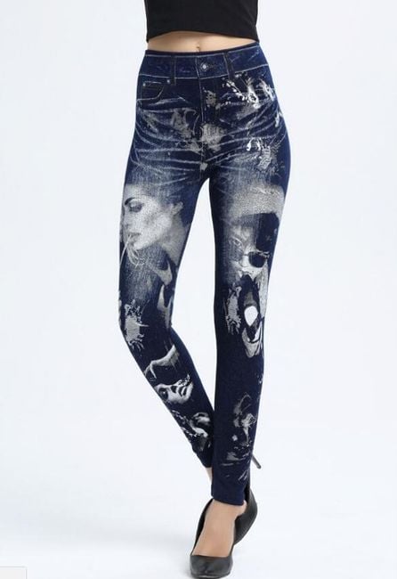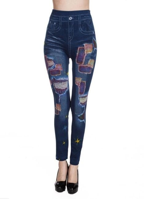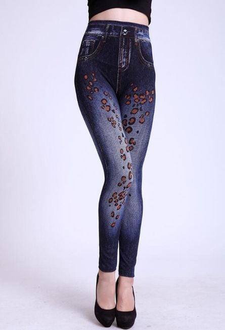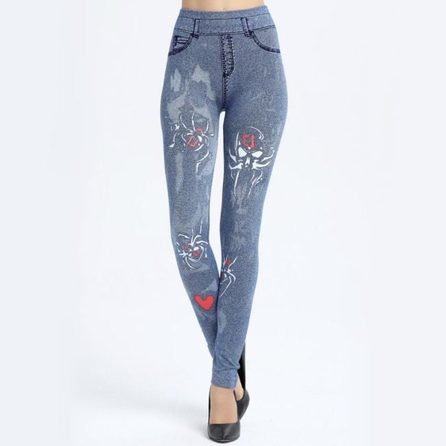 Women's denim-style trousers are enhanced with colourful motifs.