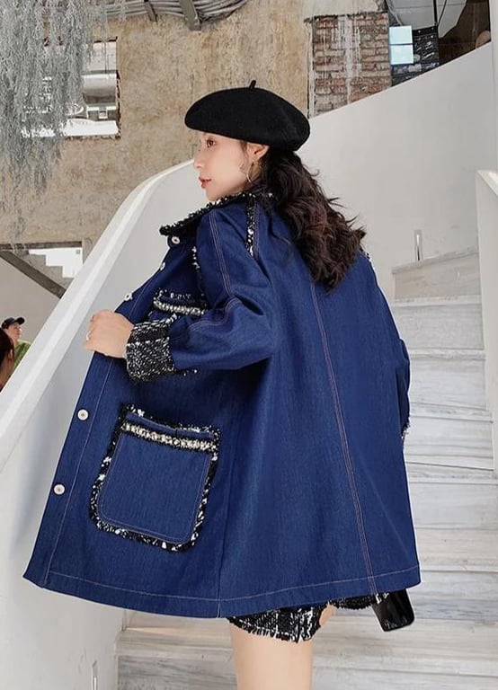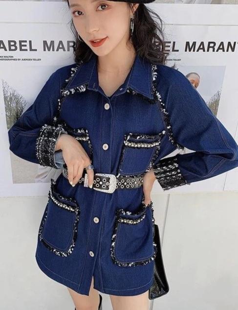 Original women's denim jacket with embellishments on the hems, pockets, and sleeves. Without a belt.