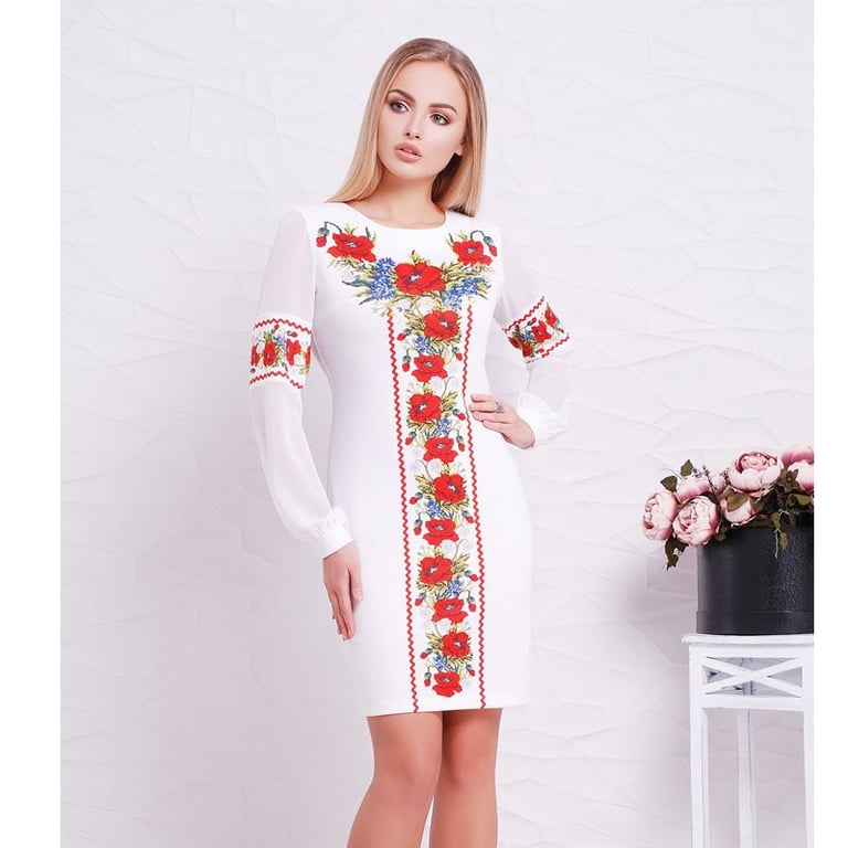 Women's straight-cut dress with long tulle sleeves and a round neckline. The dress is available in black or white and is adorned with colourful floral embroidery. Available in plus size options.