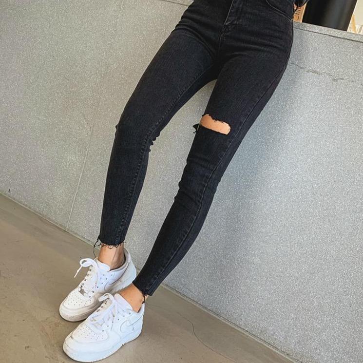Women's fashionable stretch jeans in black. The jeans feature a cut-out on the leg.