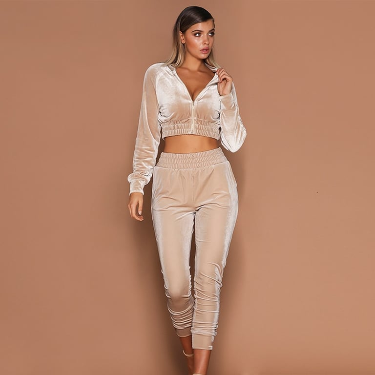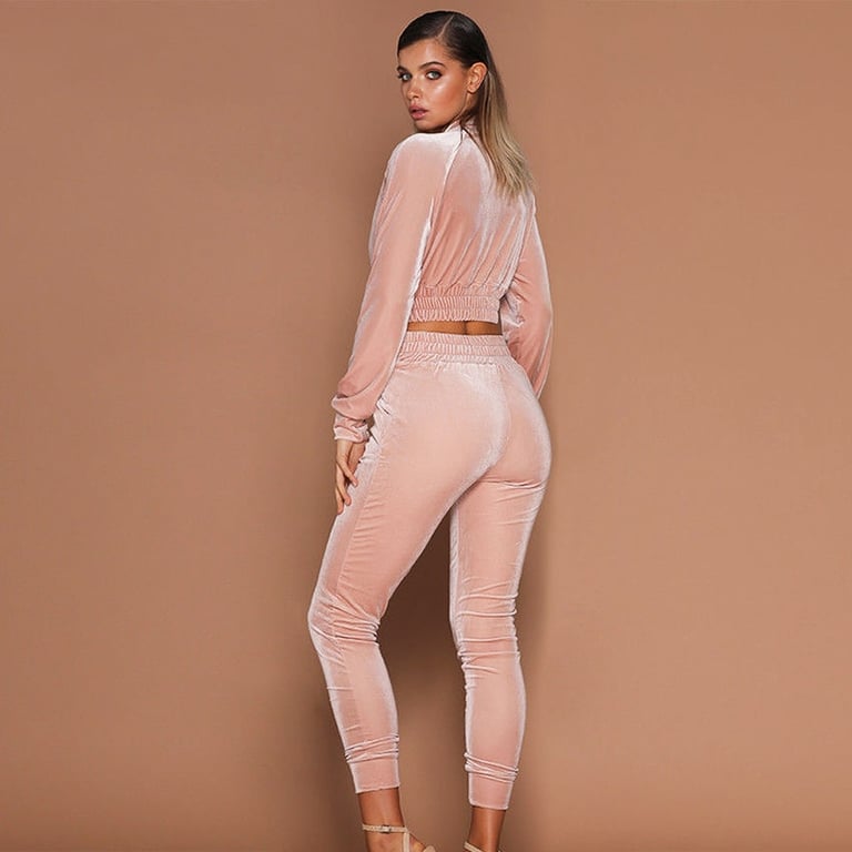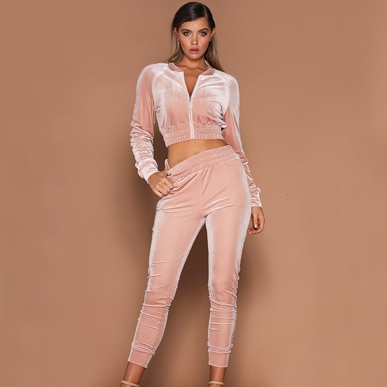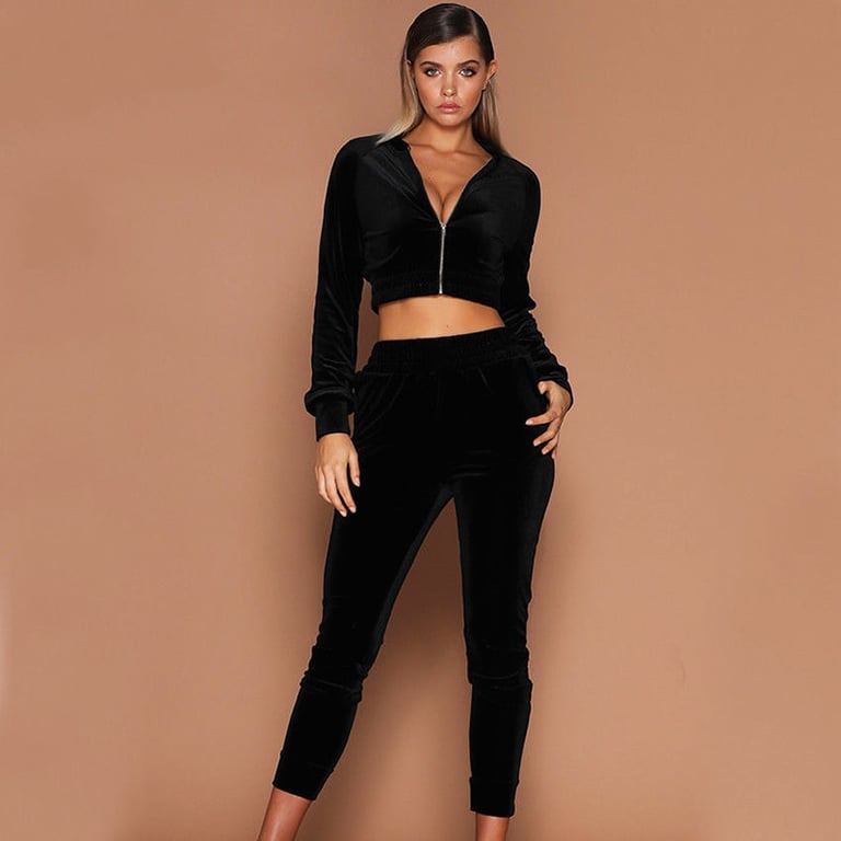 The women's velvet crop top tracksuit looks stylish and is comfortable to wear.