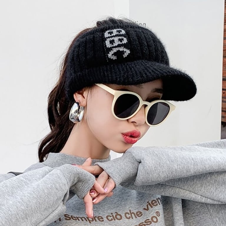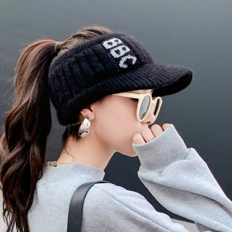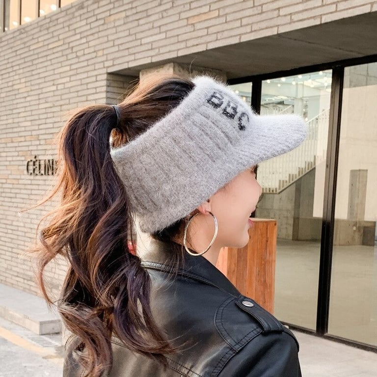 Women's fashionable knitted winter cap with a hole for a ponytail